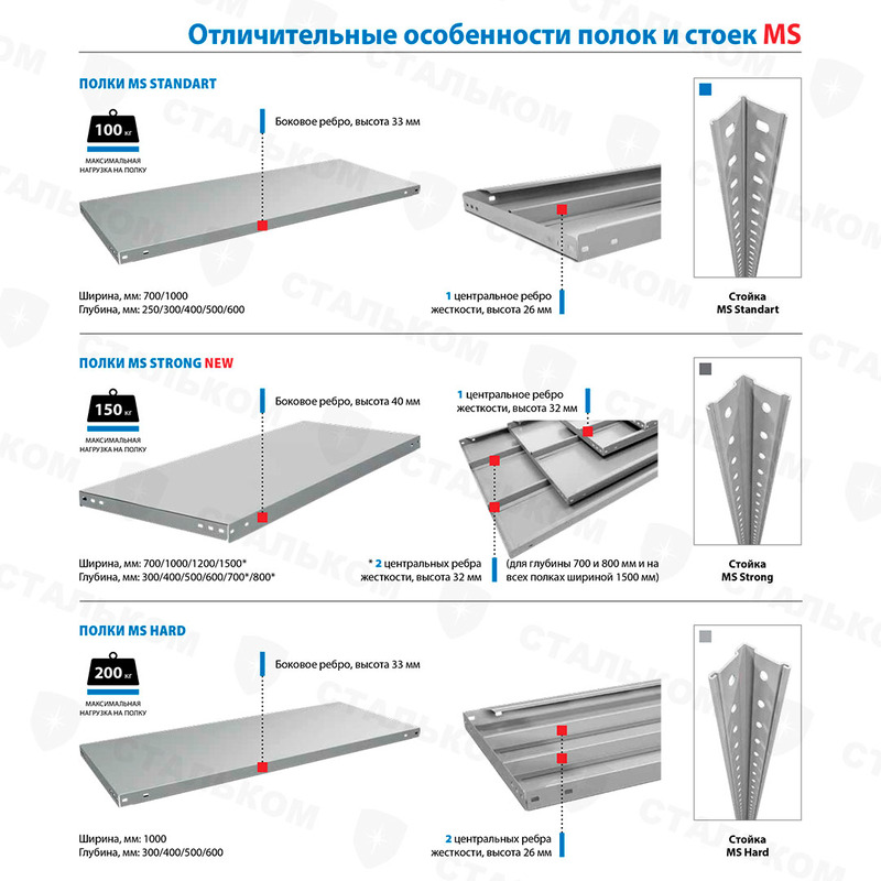 - Стеллажи Практик: MS Standart, Strong, Hard, Pro, U